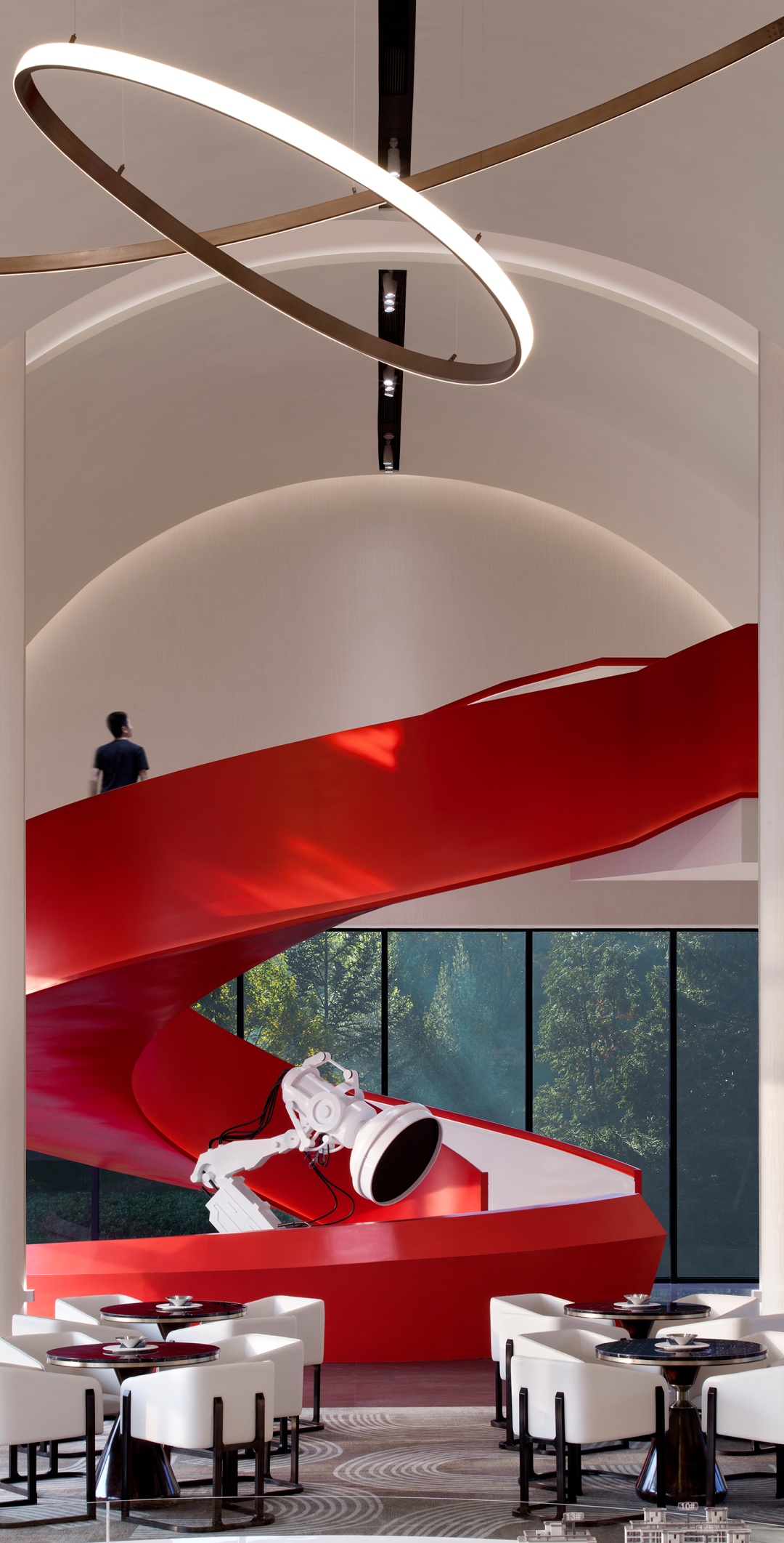 鲜艳的主题色在素雅的空间中分外夺目,整个主题造型好似飘带,又宛若蛟龙,拔地而起,穿过连廊,再从洽谈区这边探出一截,不仅成为连接楼上楼下的纽带,还以其优美独特的造型形成整个空间最重要的亮点。