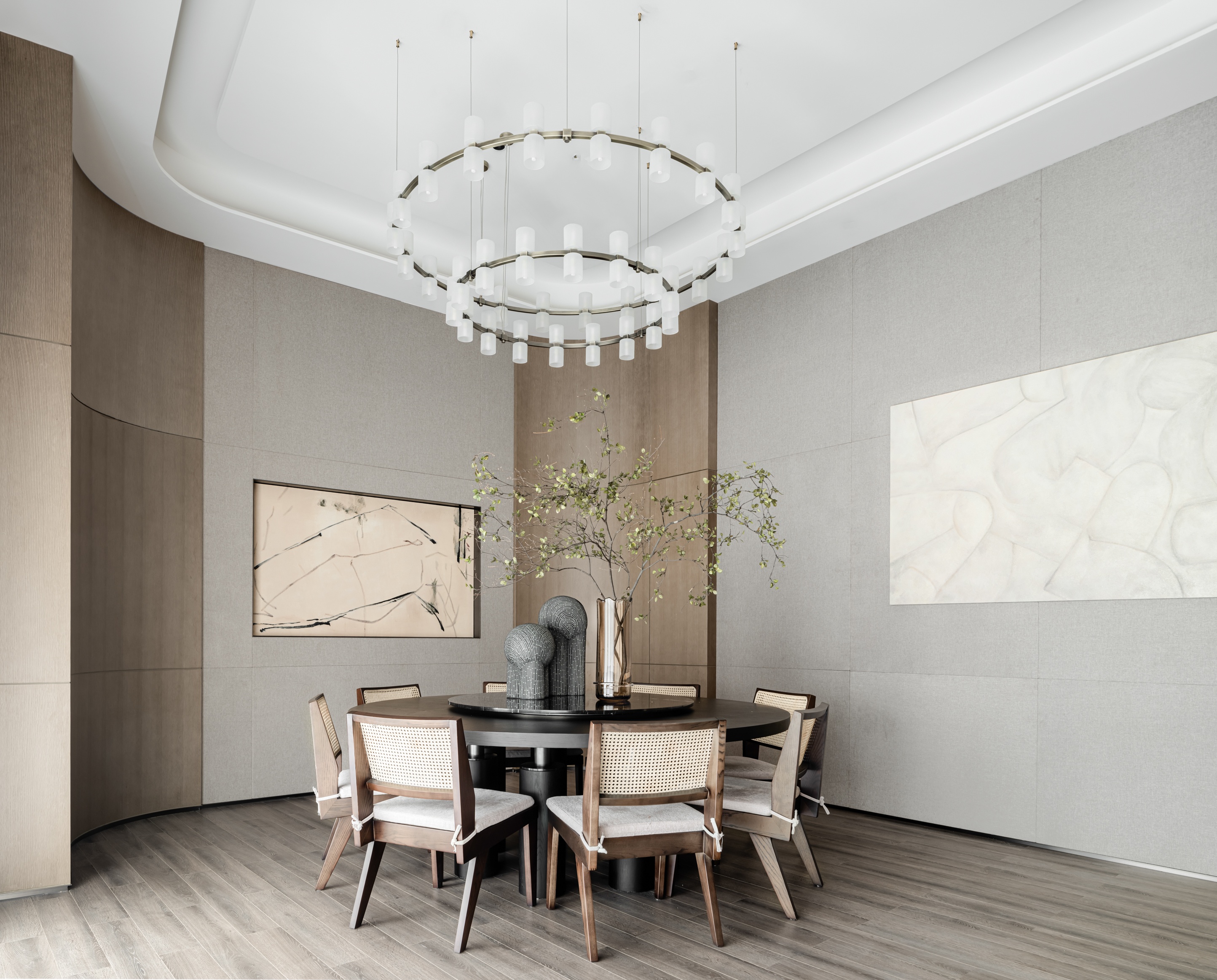 雅致的木,极致的黑,平衡而文雅地描绘空间秩序和内部逻辑。一株绿植捕捉光影的同时,营造一种独特风骨的东方意境。